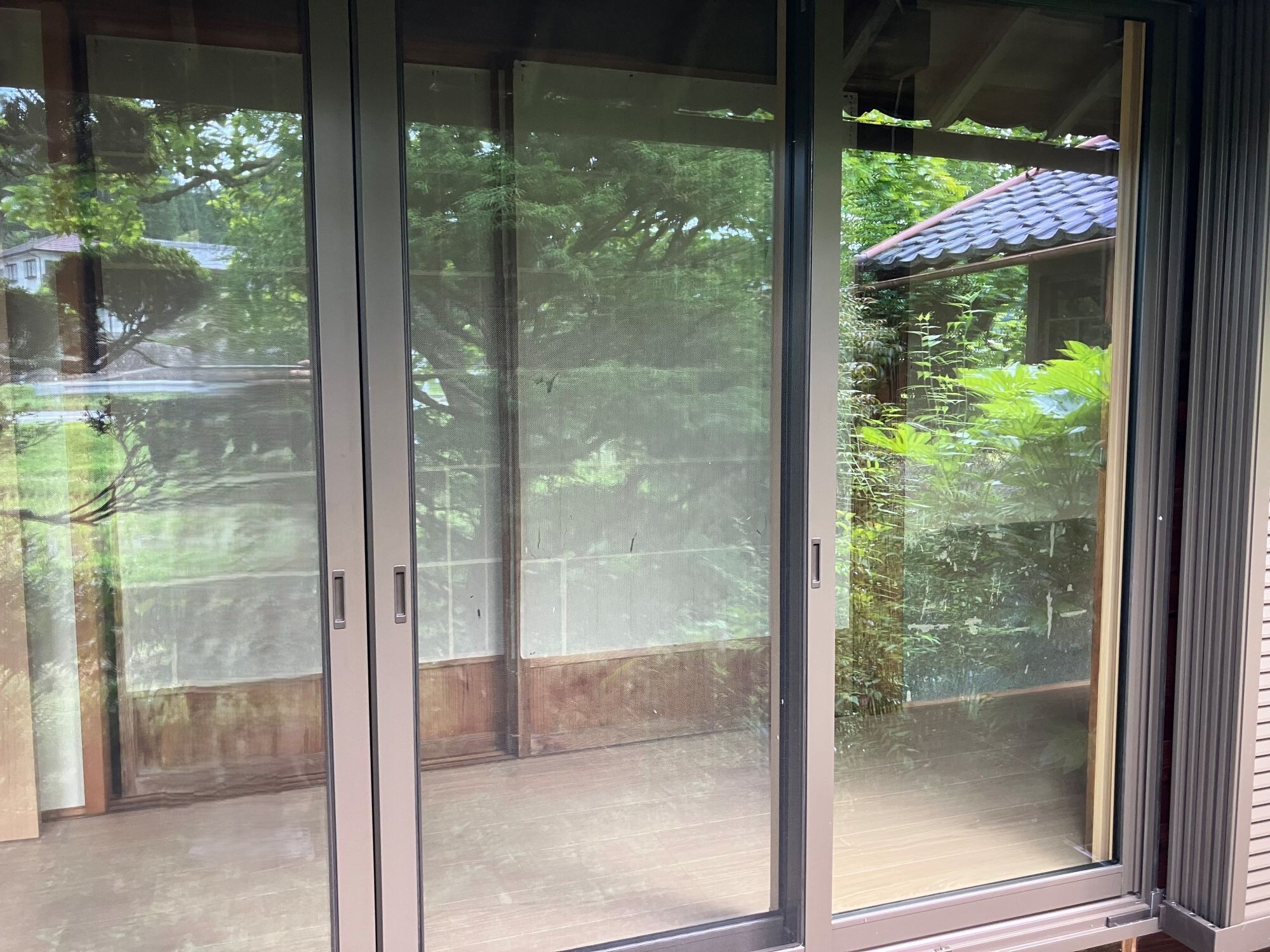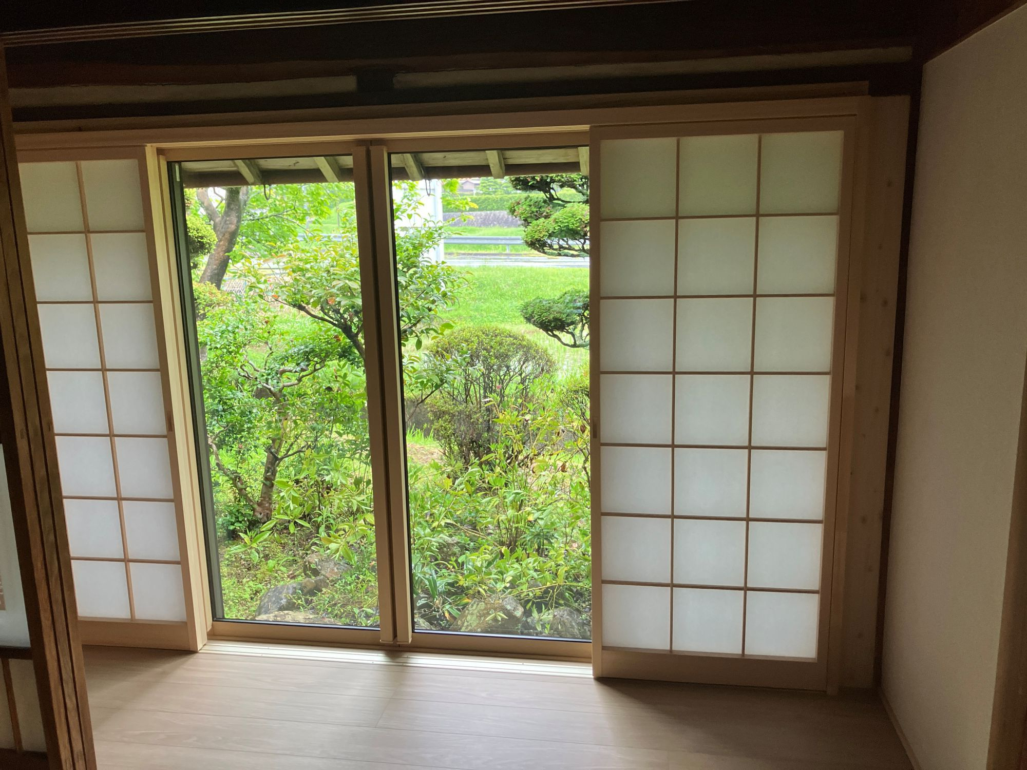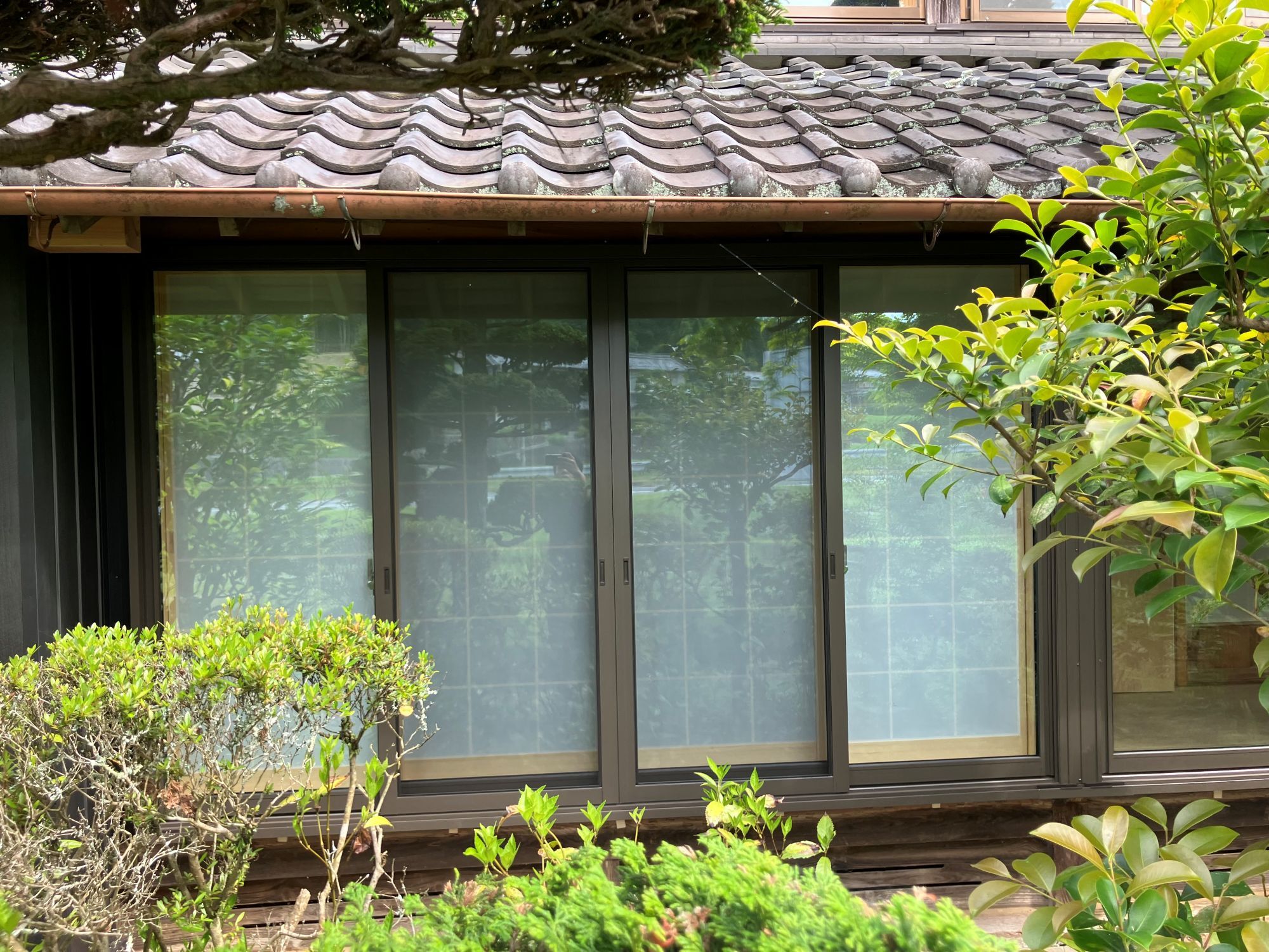 庭園の緑が美しい空間です。高性能窓で冬も暖かい縁側へ。
